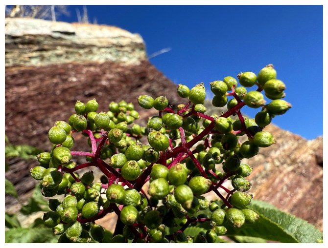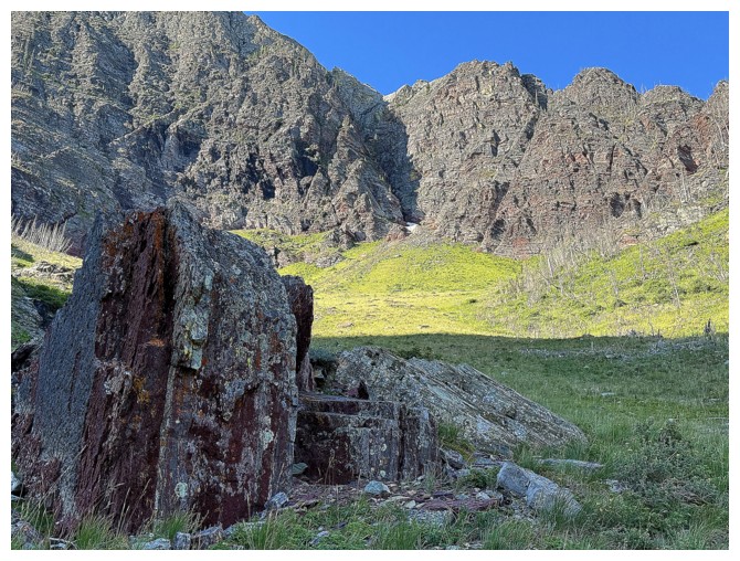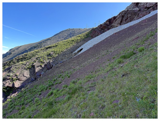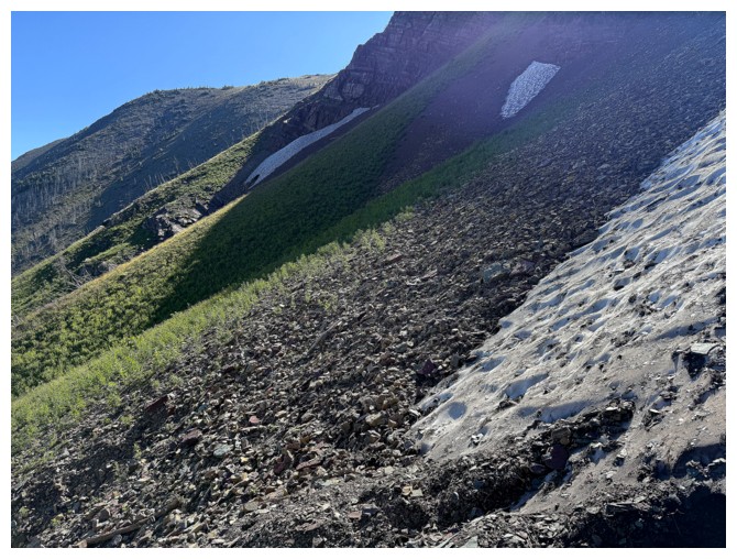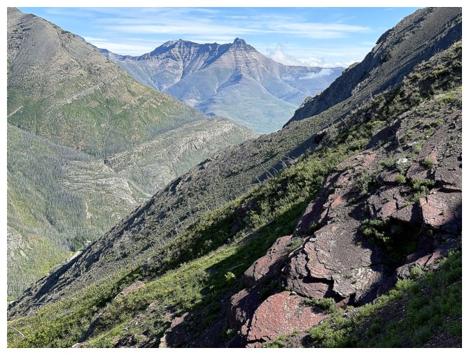 bright green, vegetated slopes, contrasting with the fine red argillite scree.