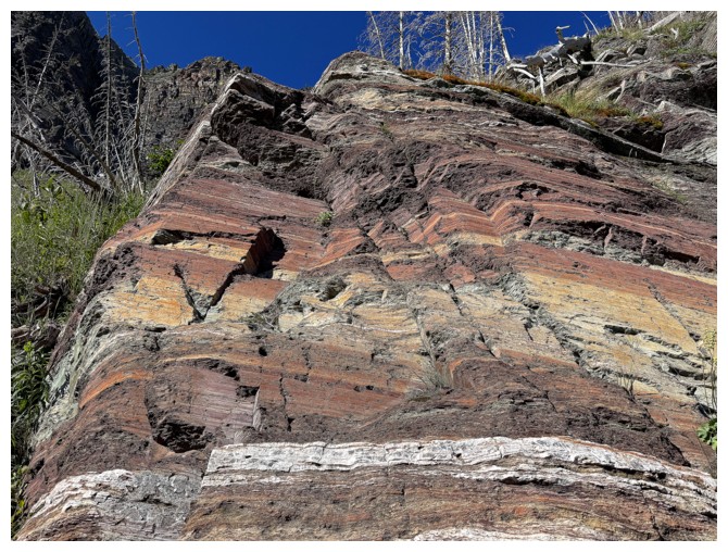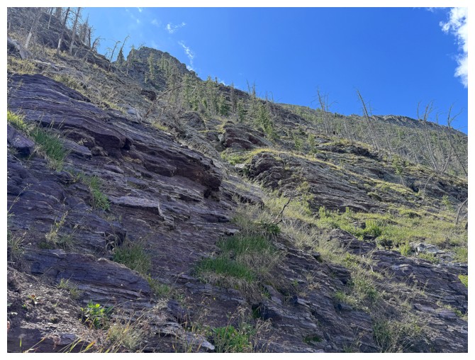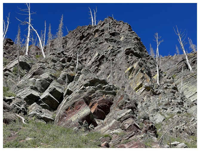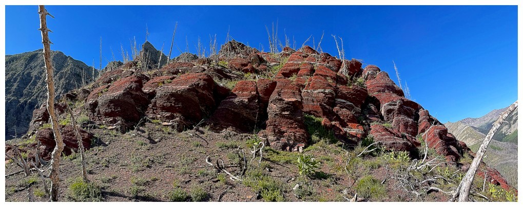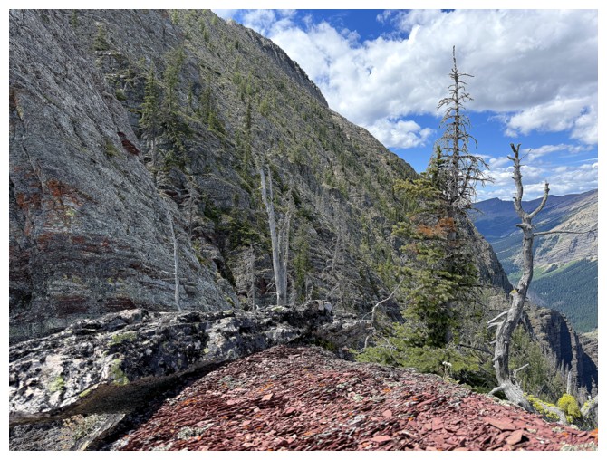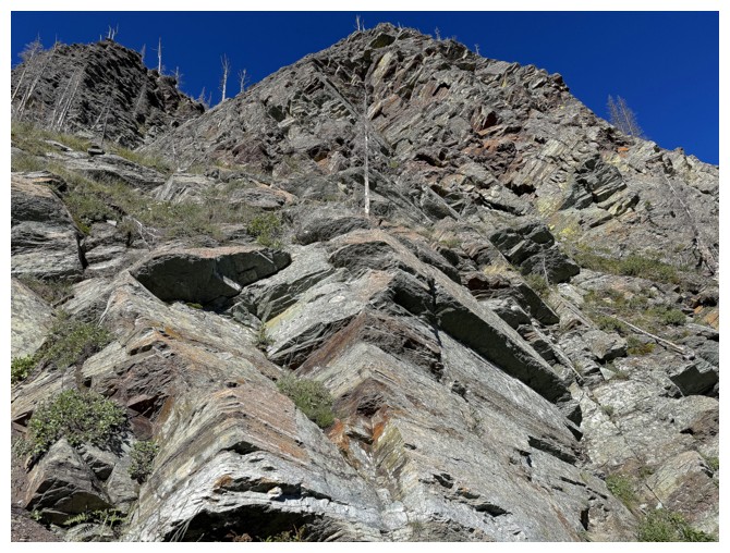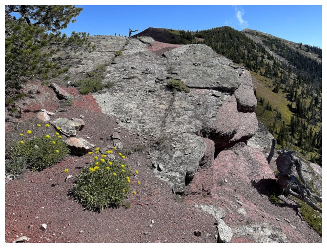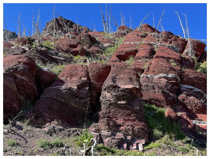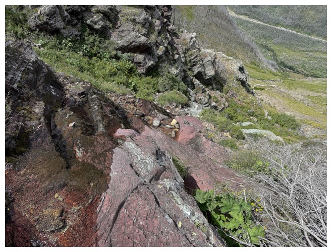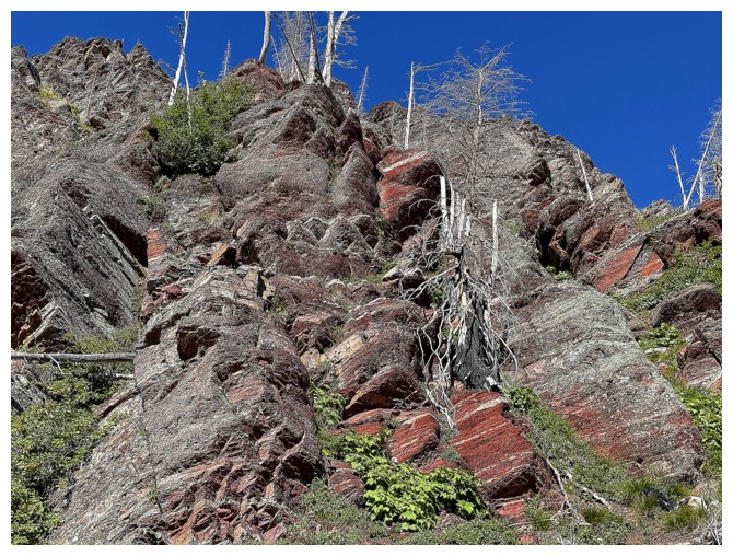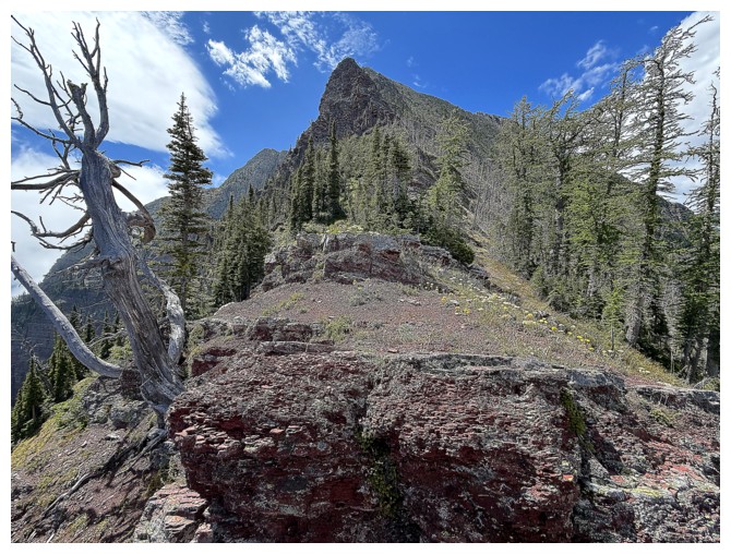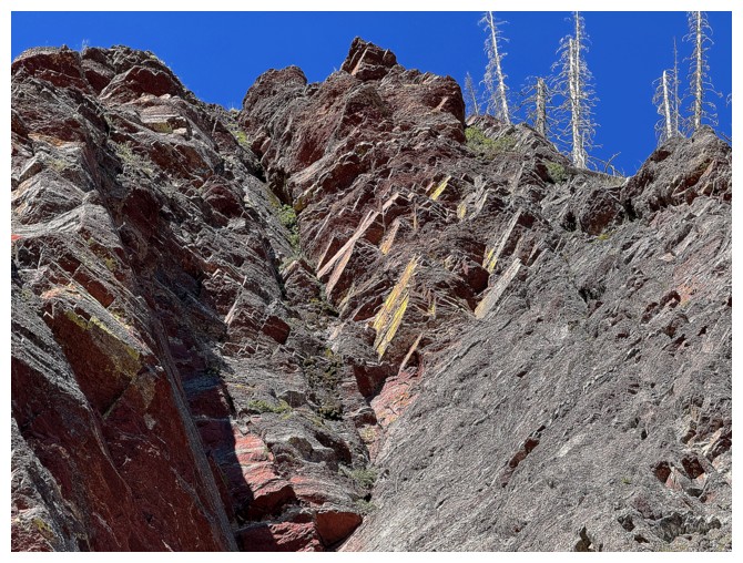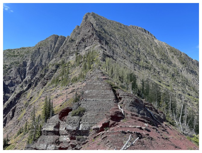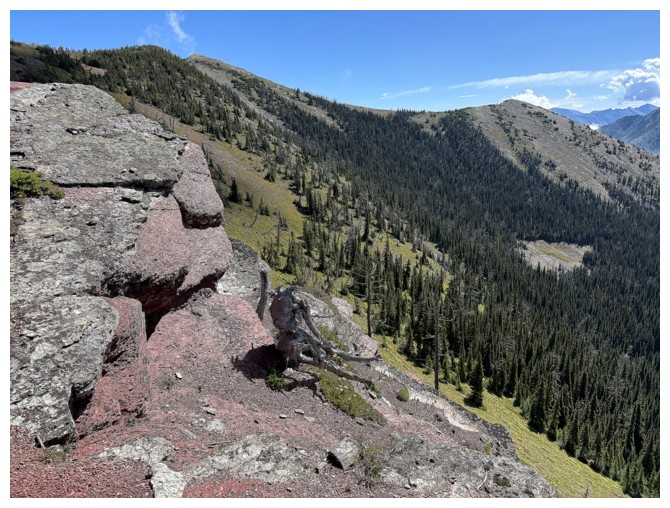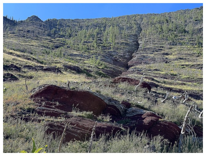 The red argillite band that prompted me to ascend The Senator several weeks earlier