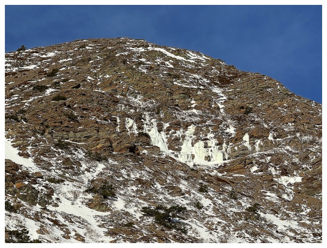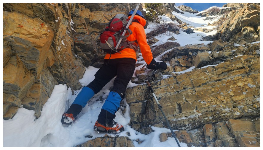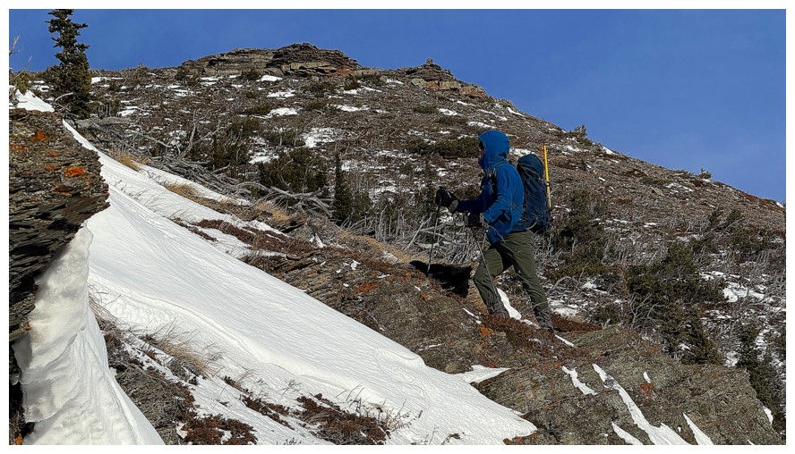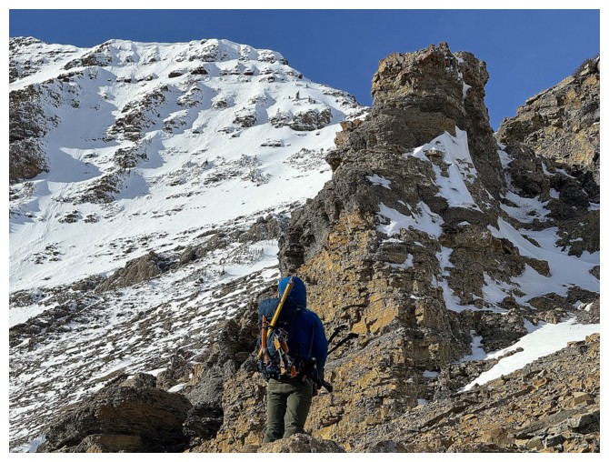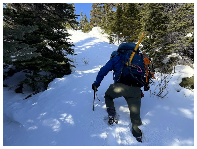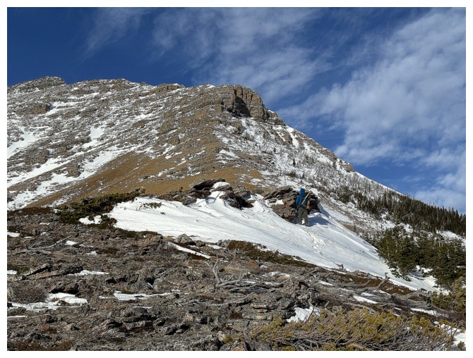 Happy for microspikes here. Dave did an awesome job ascending all the snowy terrain without the aid of spikes (photo by Dave).