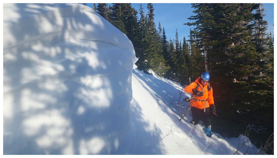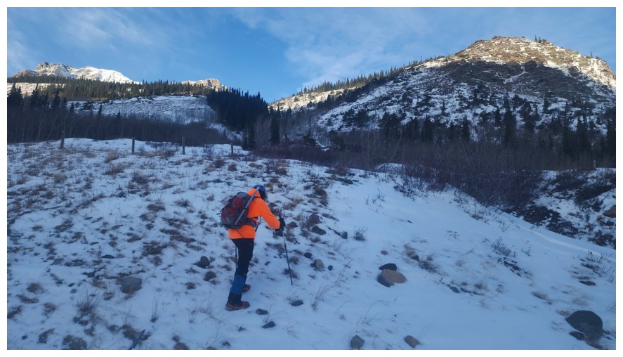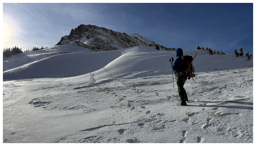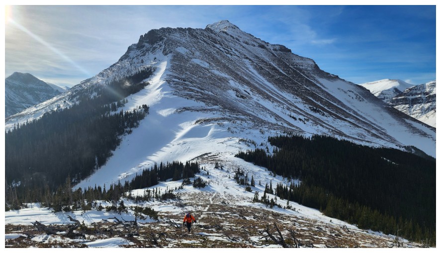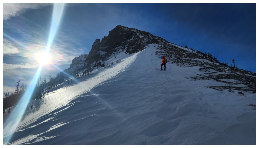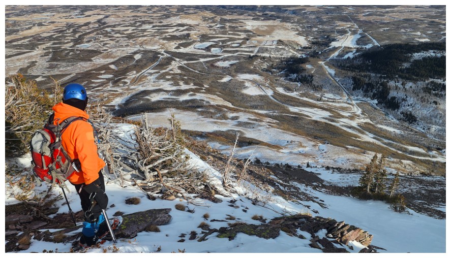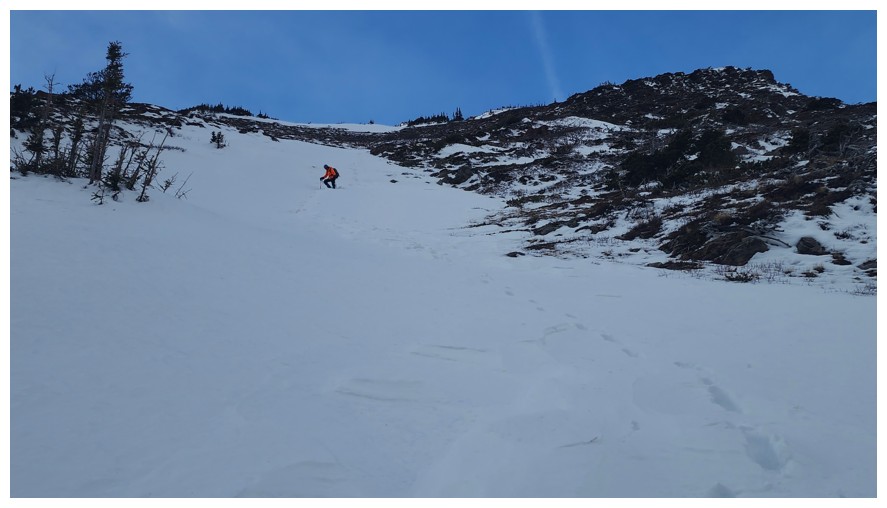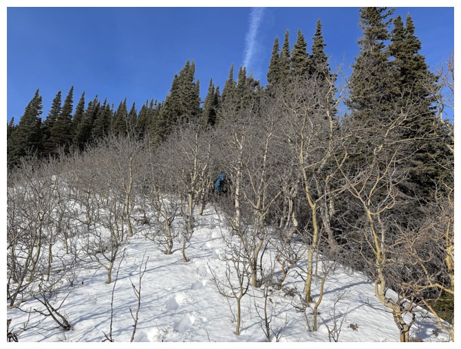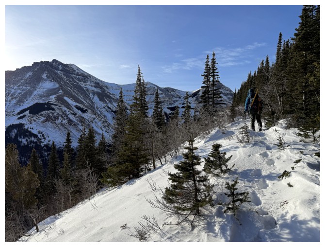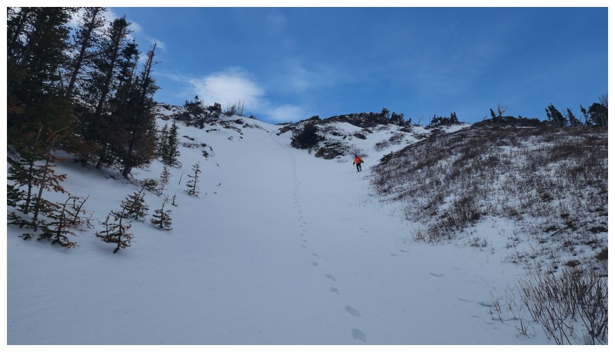 Above treeline and traversing onto open, snow-free slopes