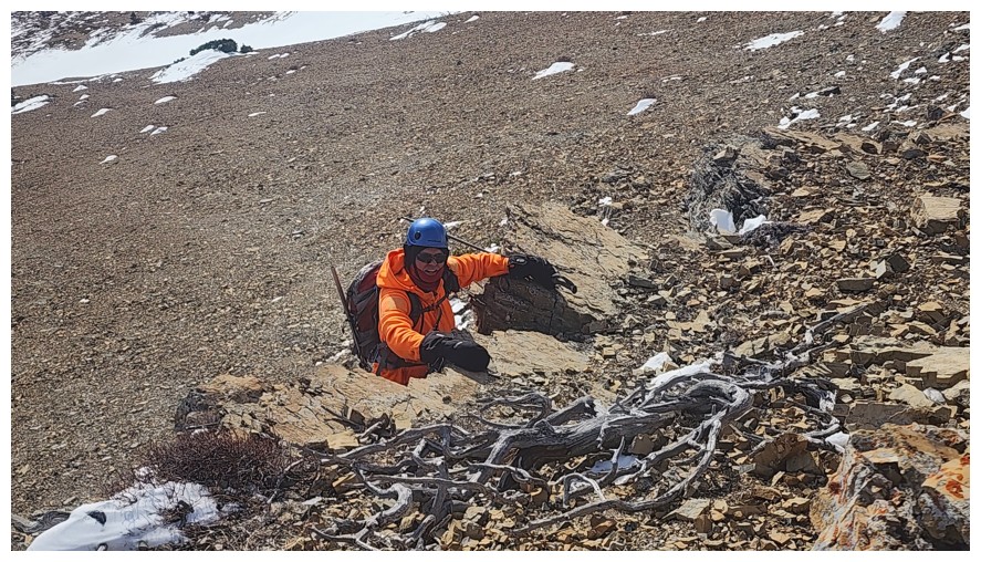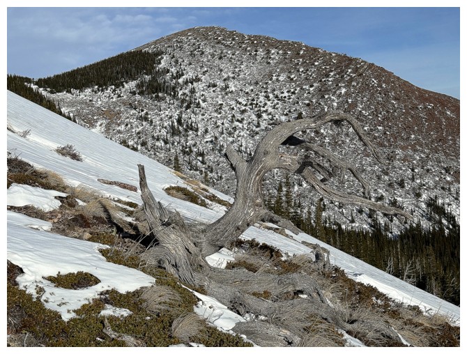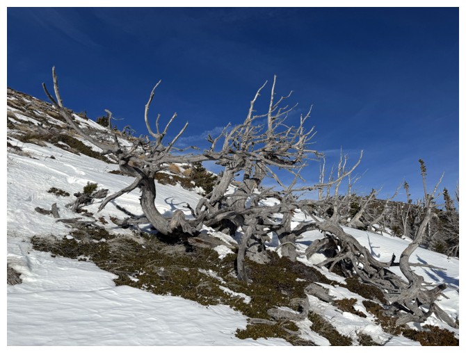 One of many twisted, dead trees on the slopes