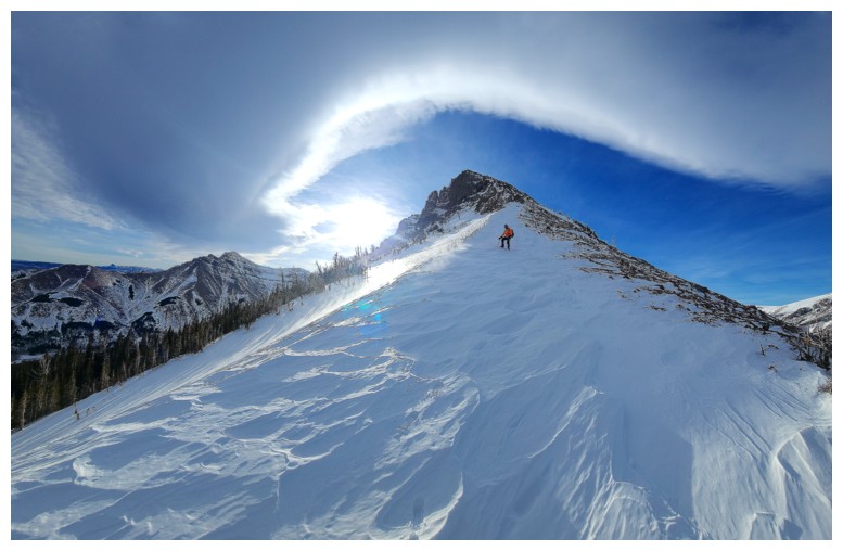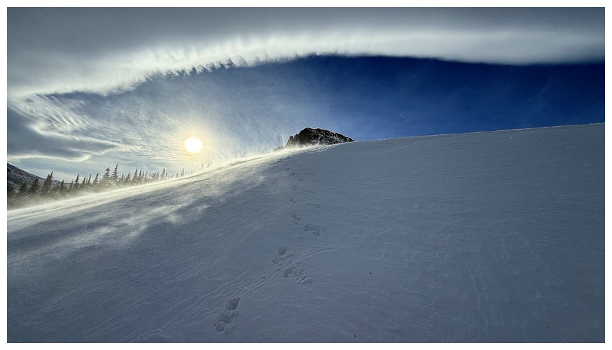 super cool scenes of blowing snow and an even cooler Chinook arch.