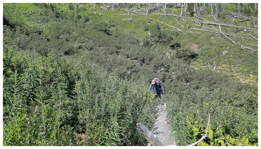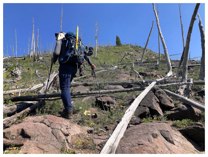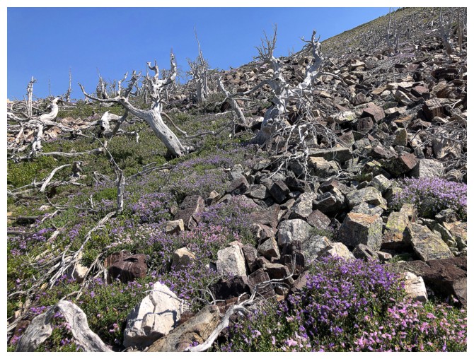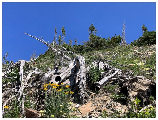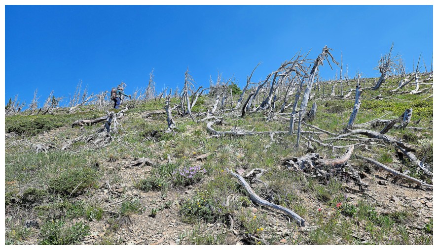 An interesting section with small boulders, flowers, vegetation, and dead trees