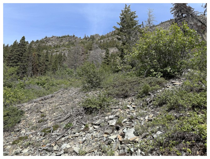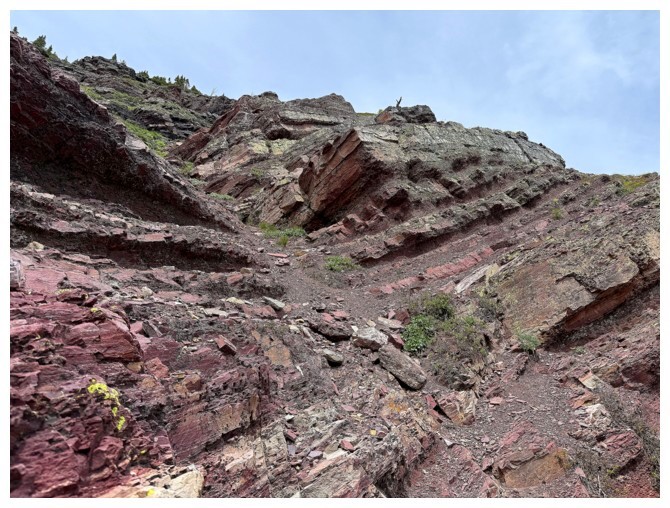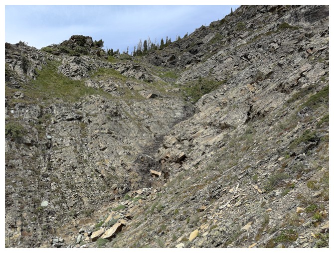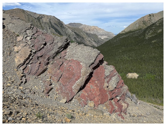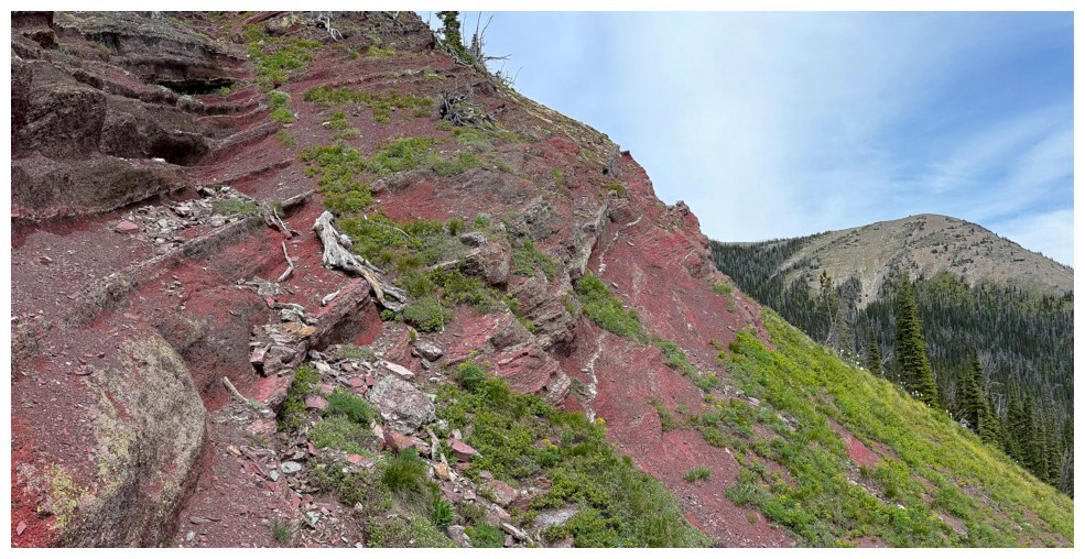 Now aiming for a significant band of red argillite guarding the ridge I need to be on