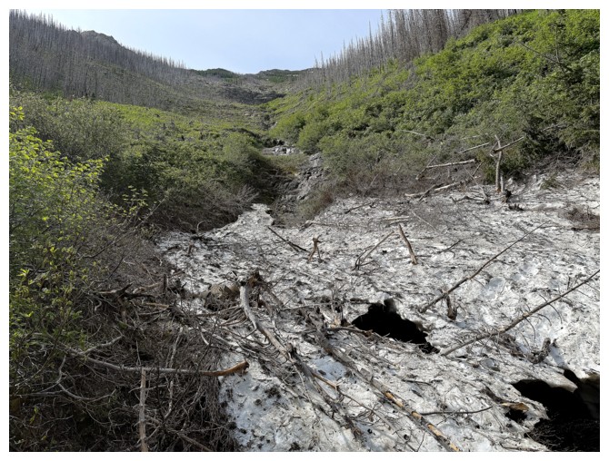 unpleasant section of bushwhacking between the trail and open slopes on
