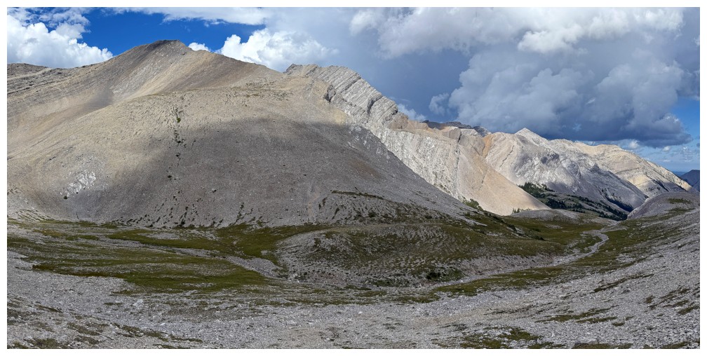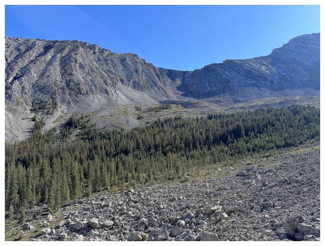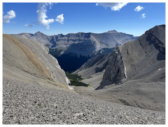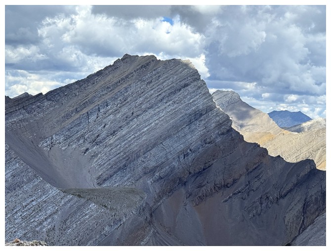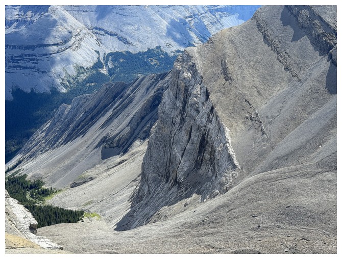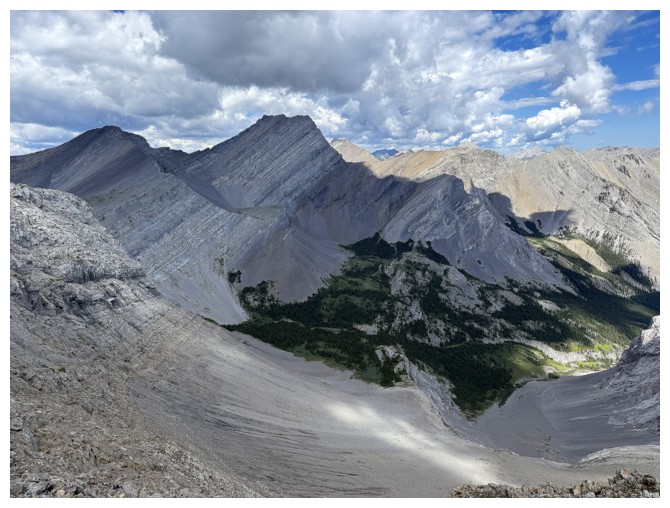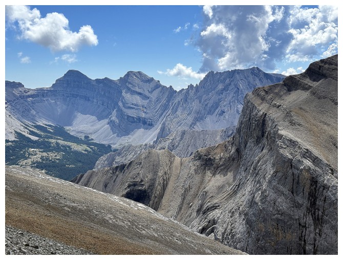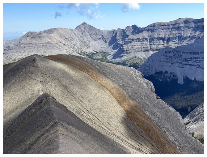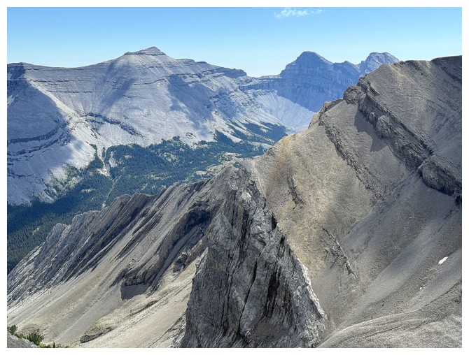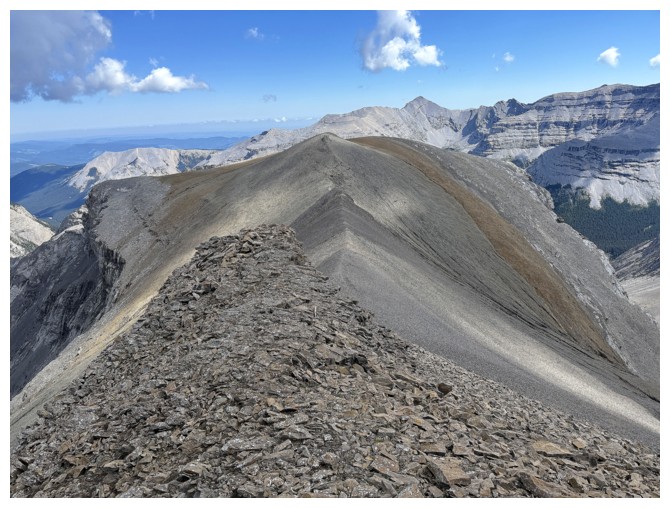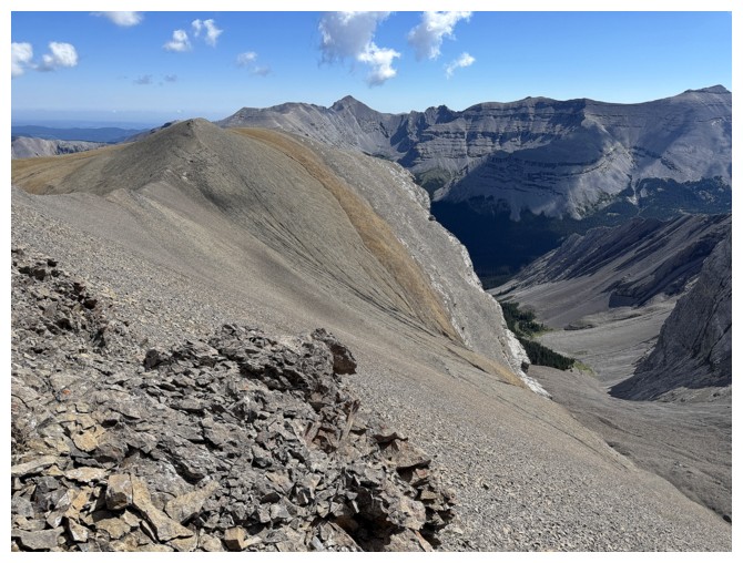 Looking down the ridge I wasn't able to traverse on the previous attempt. South Highwood Peak at the right.