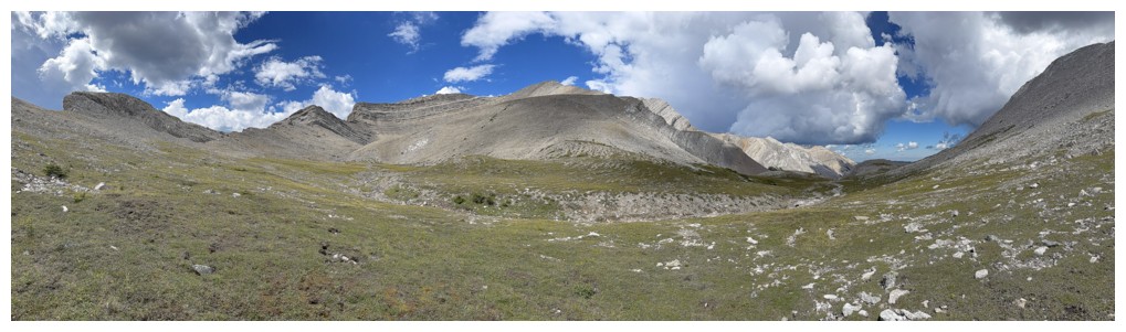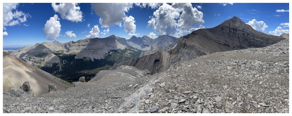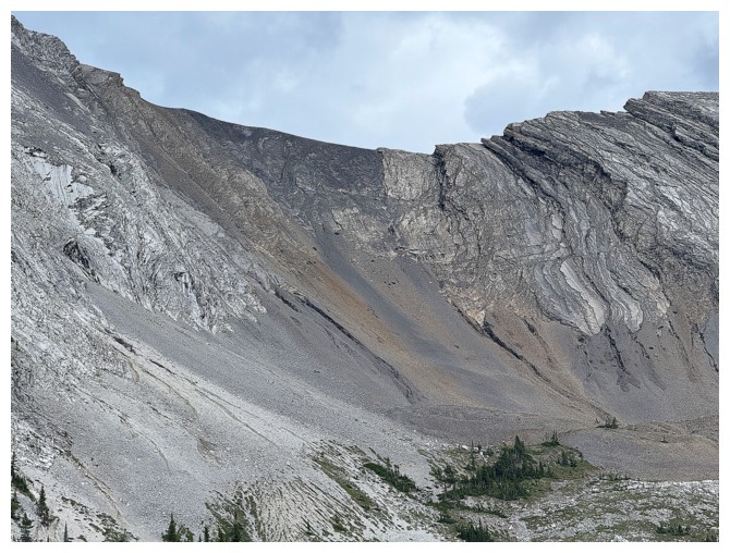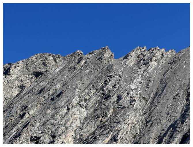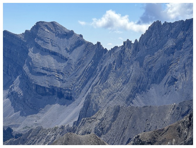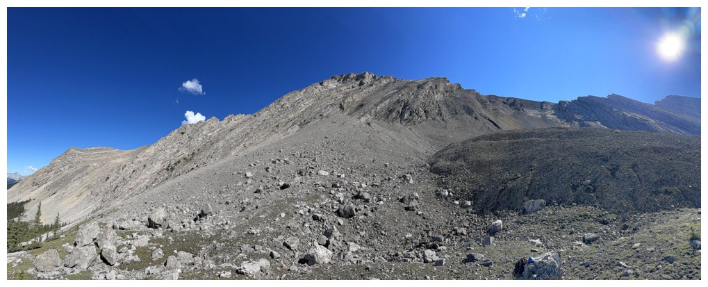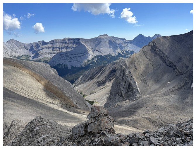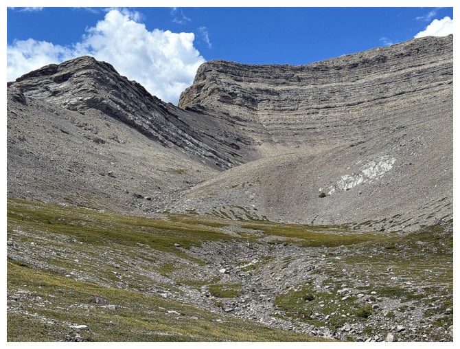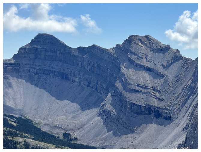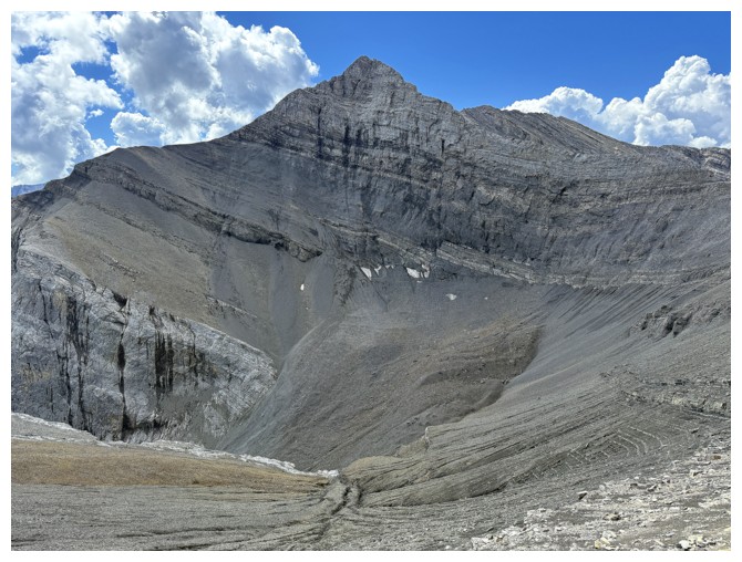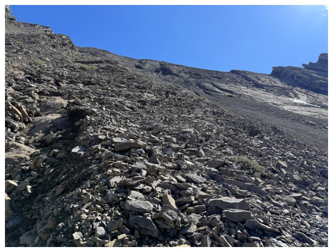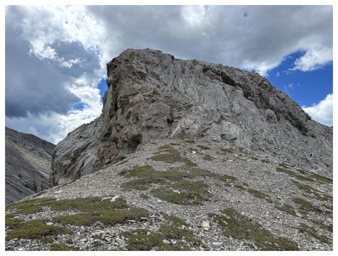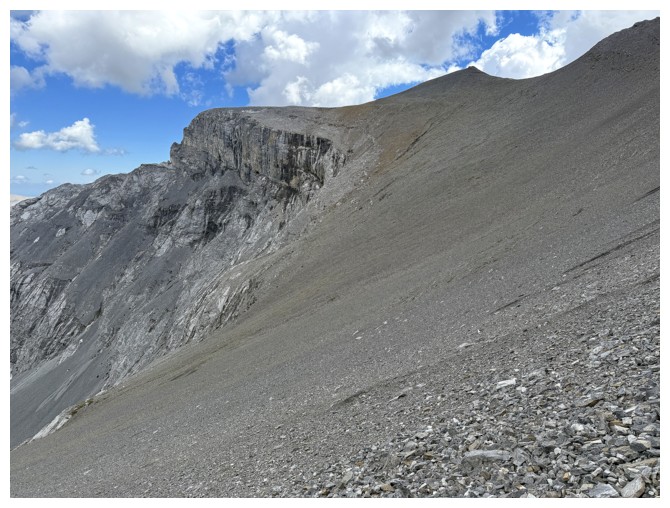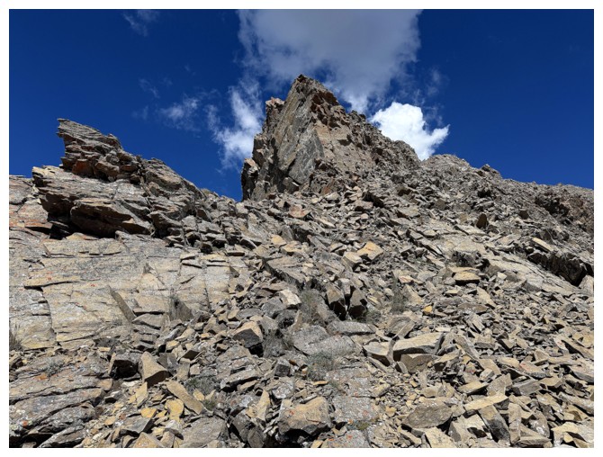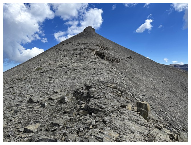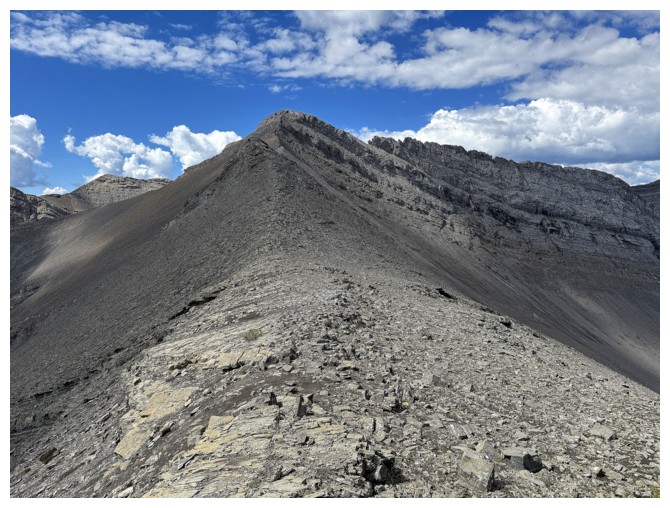 Just an easy rubble slog to the summit with some interesting rock bands on the ridge