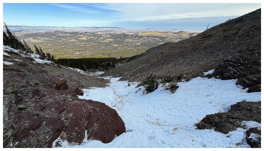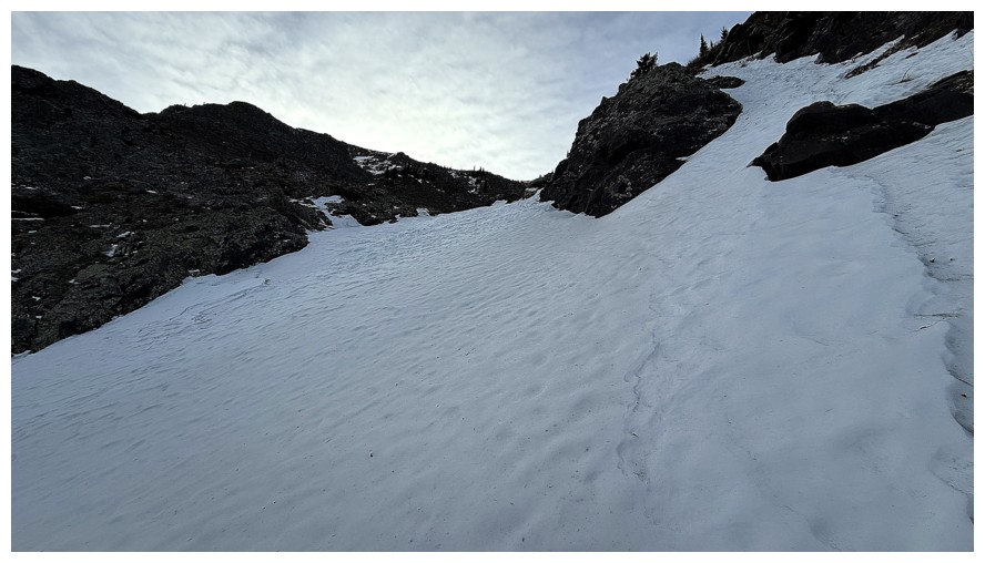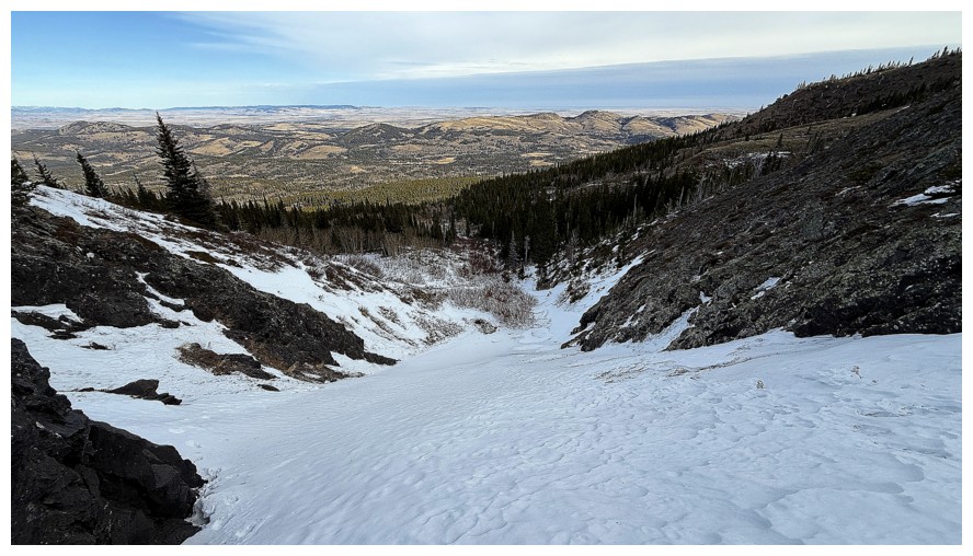 snow-filled gully in front of me was too tempting. The gully appeared to go
