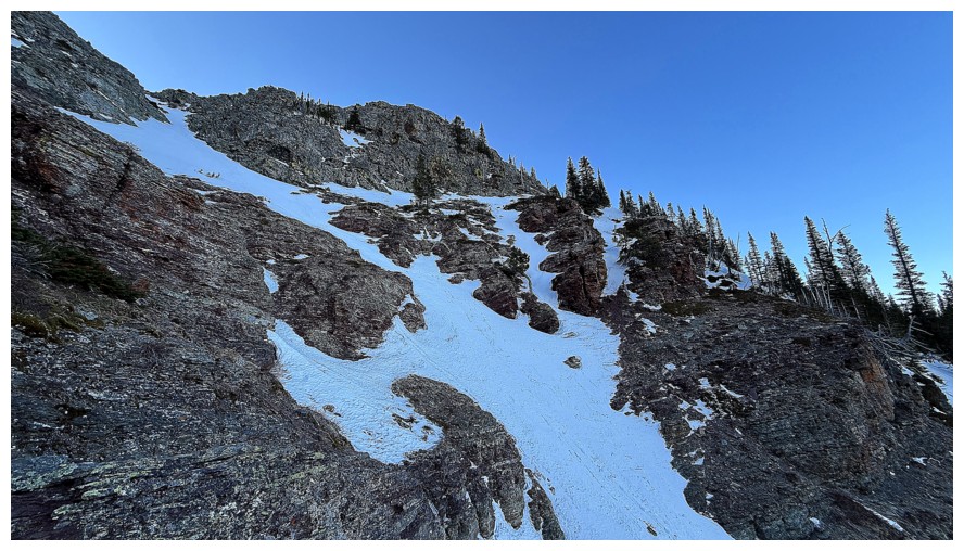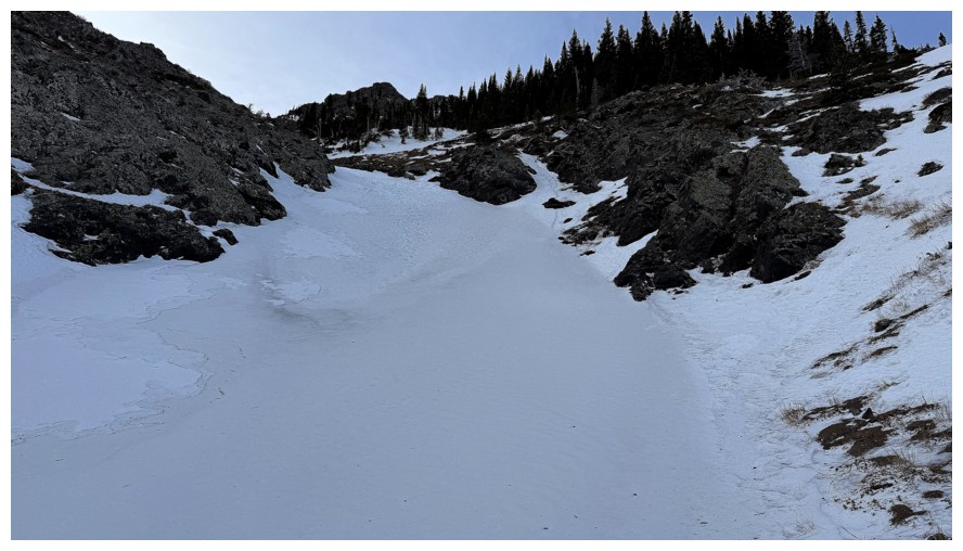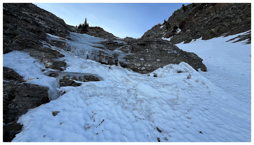 At the base of the snow gully. It's much steeper than it looks and the snow is rock hard.