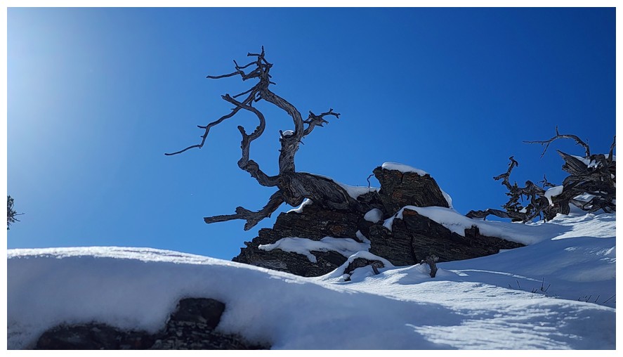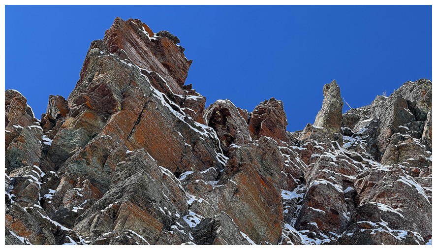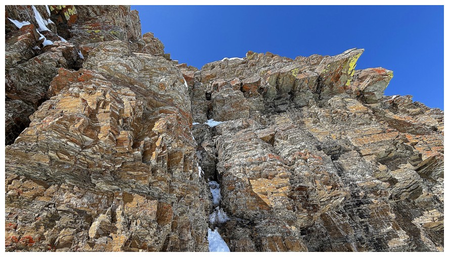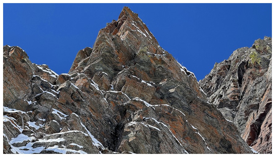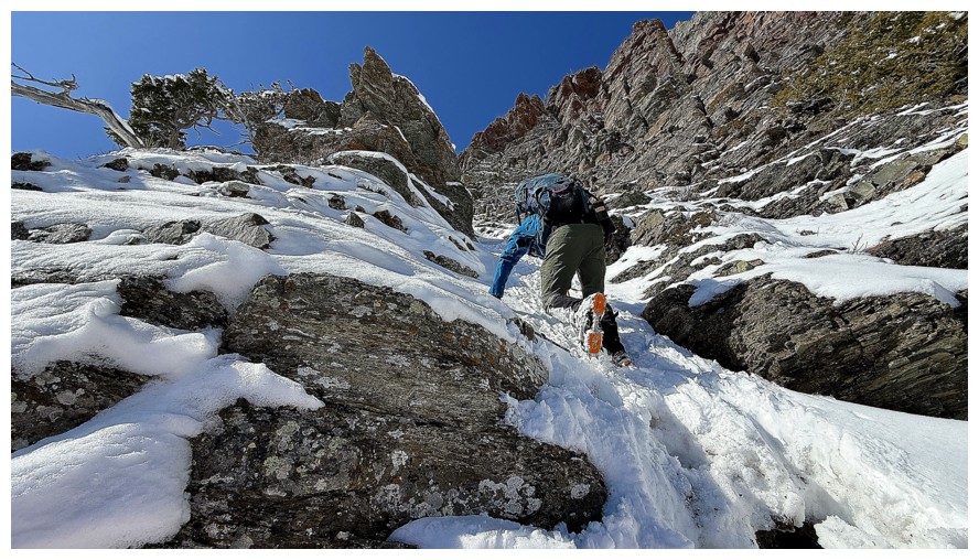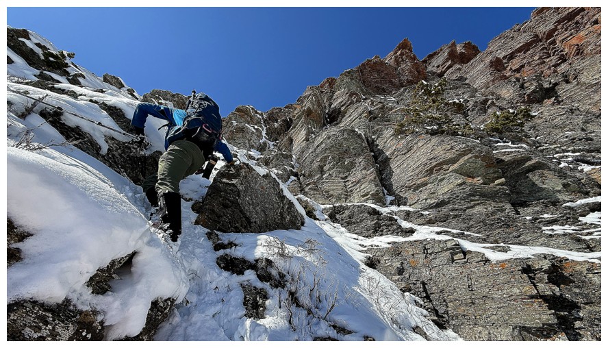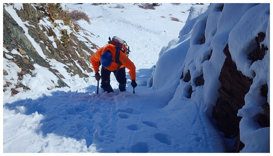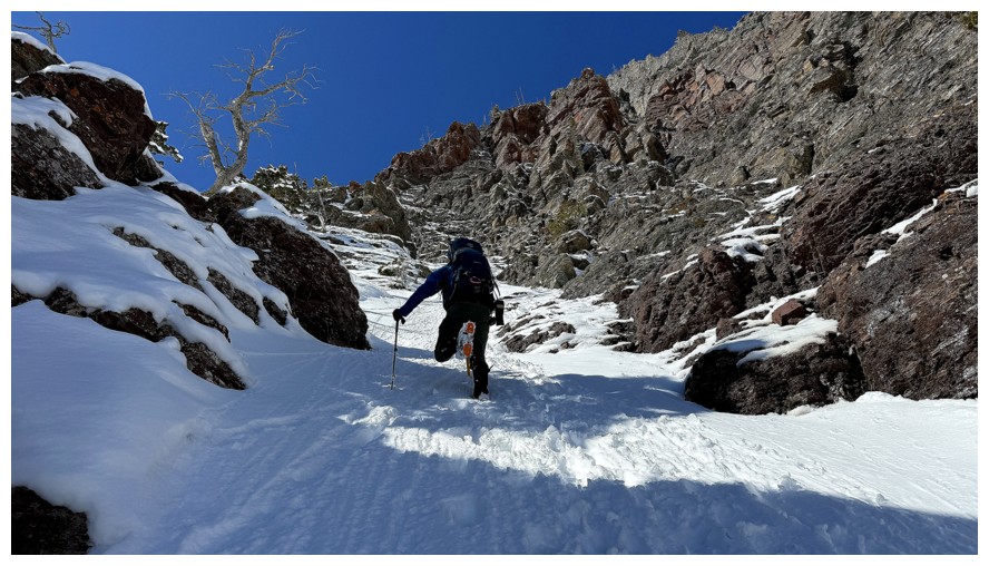 rock as ascending the couloir. The fresh white snow underfoot and deep blue sky