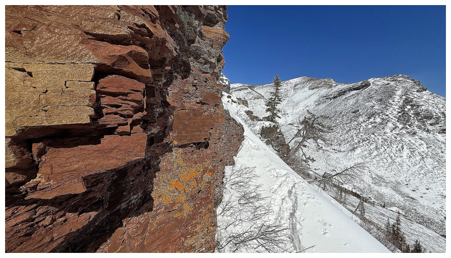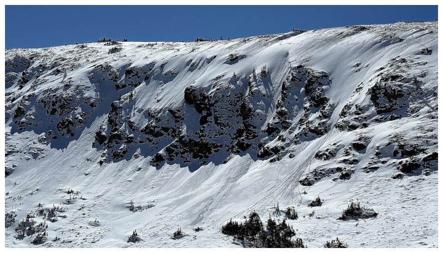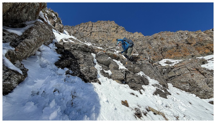 There could be a very steep scramble route up here, but not when there's any snow and ice on the route