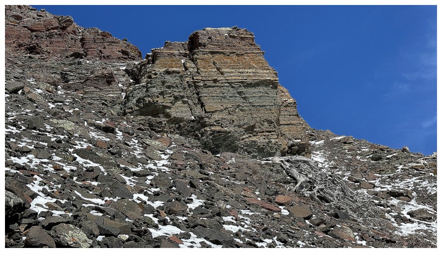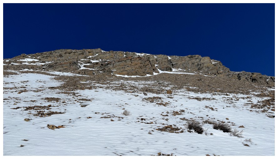 Also didn't know it at the time, but we would be traversing to the right at the base of the rock band at the top several hours later