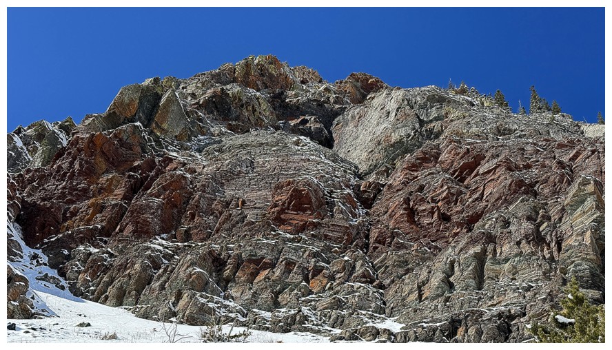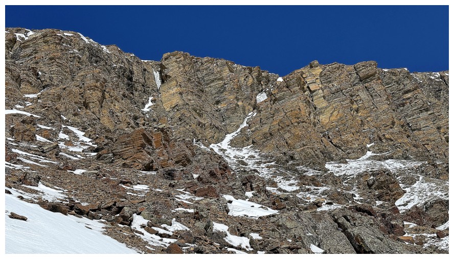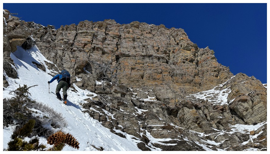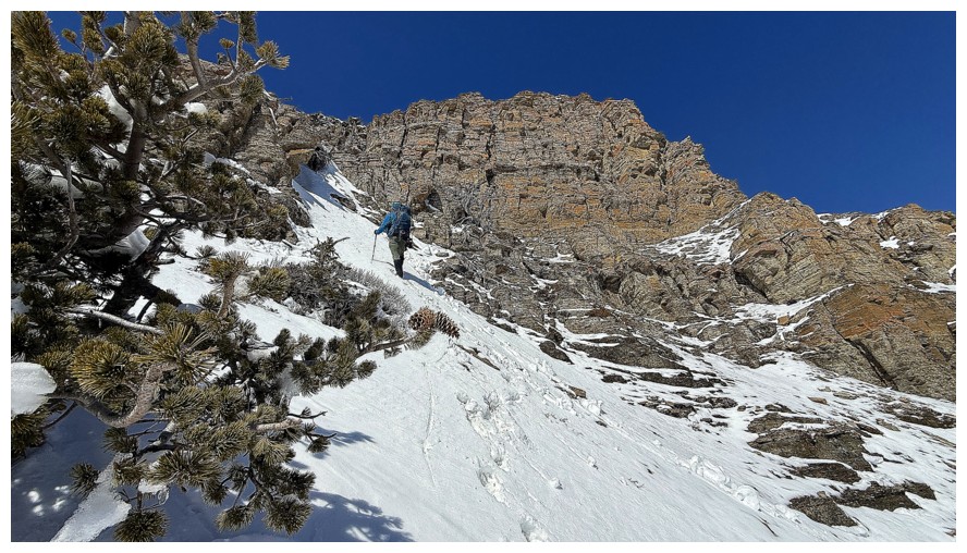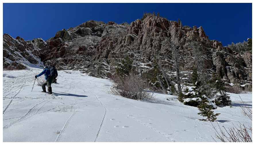 I took a less steep line and ended up right under the immense wall of rock (photo by Dave)