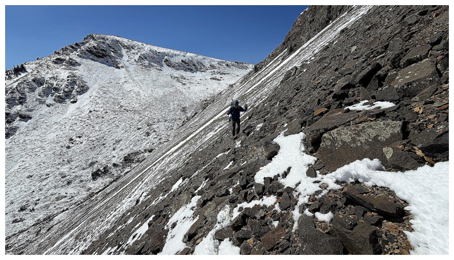 We both descended to easier terrain here to avoid having to downclimb rock bands ahead