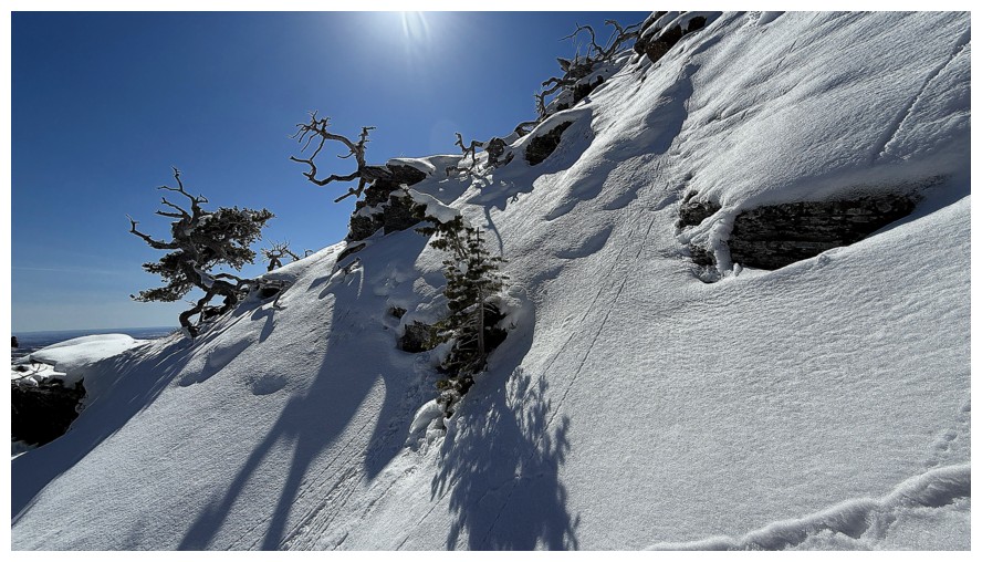 to fairly steep angles for a few short sections. Thankfully, the new snow made