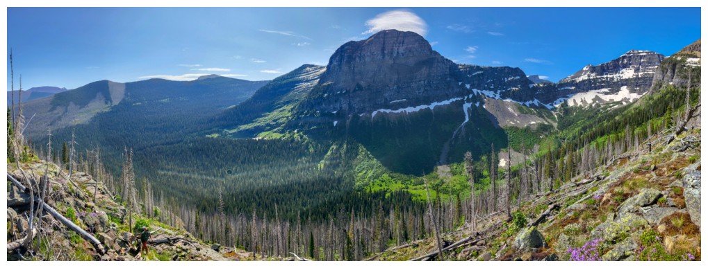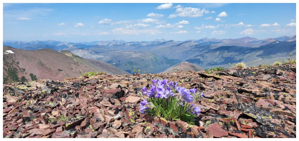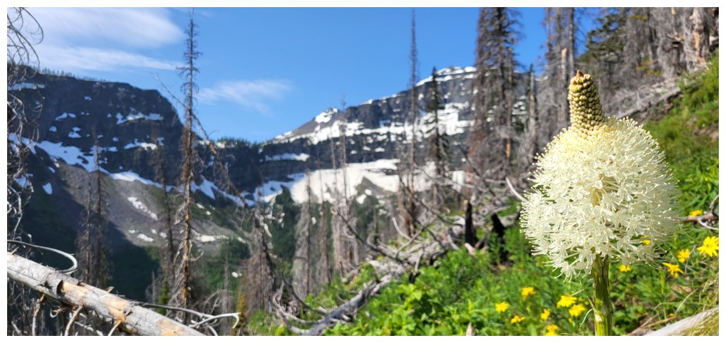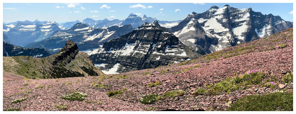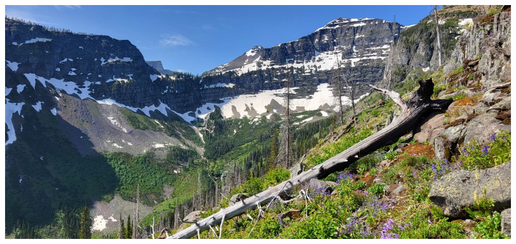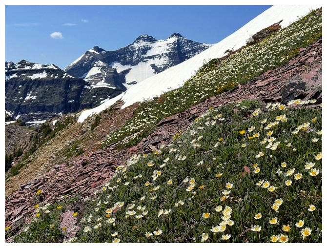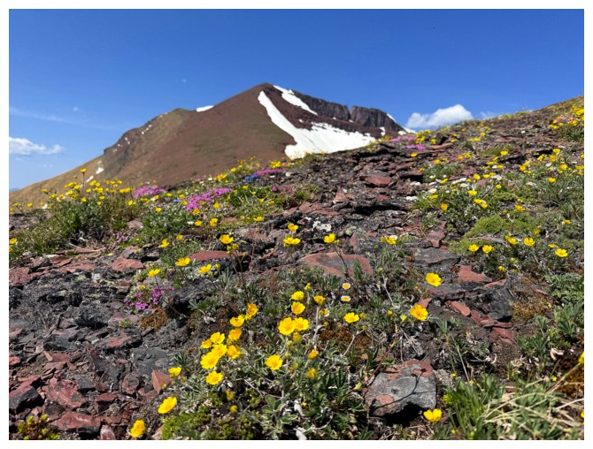 mountains; purple, yellow, and white wildflowers littered the slopes; and of