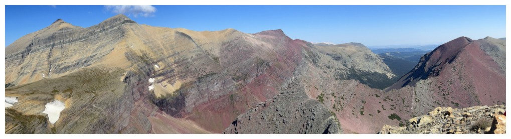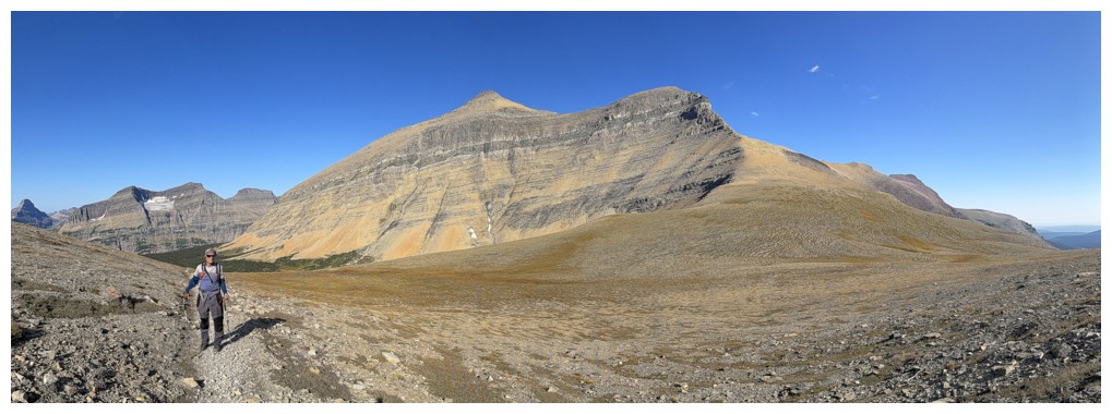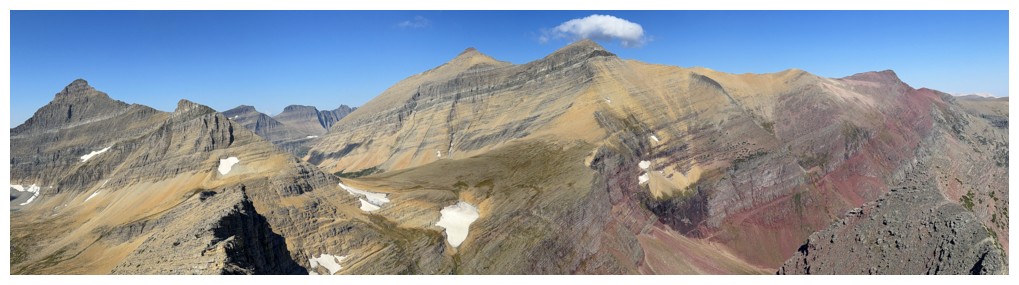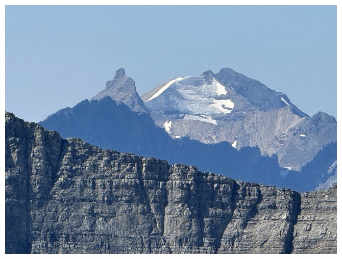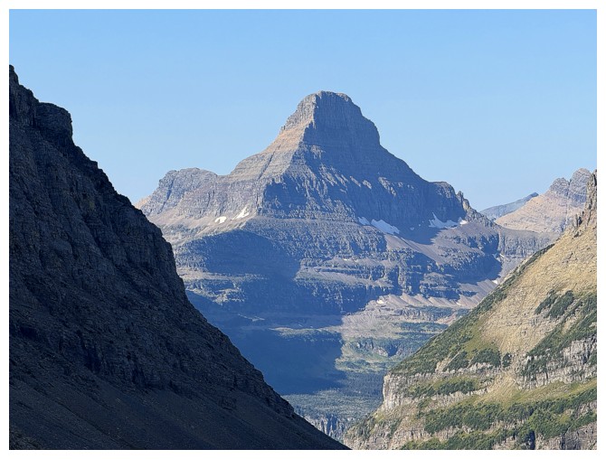 On one of several switchbacks before the first pass. Reynolds, Piegan, Pollock, Bishop's Cap, and Siyeh behind