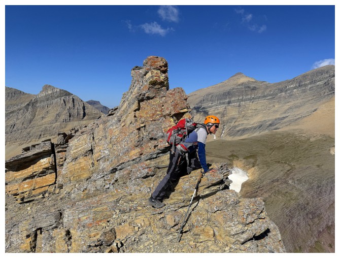The feature at the right is one of the reasons we stayed below the ridge. Downclimbing that was NOT an option!