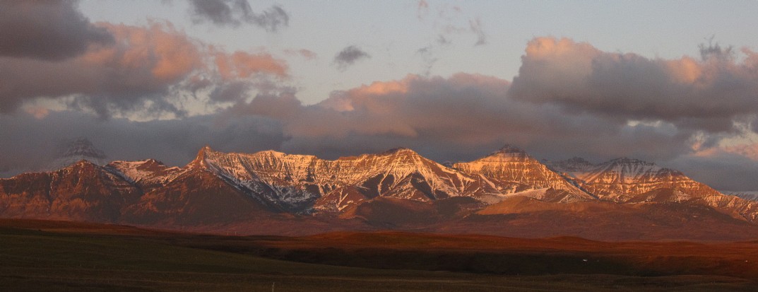Morning light and clouds over Waterton; Bellevue Hill, Galwey, Dungarvan, Lakeview Ridge, and Cloudy Ridge are visible