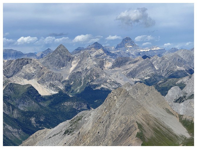 Peaks of the Kananaskis Range. Galatea, Chester, and The Fortress, among others.